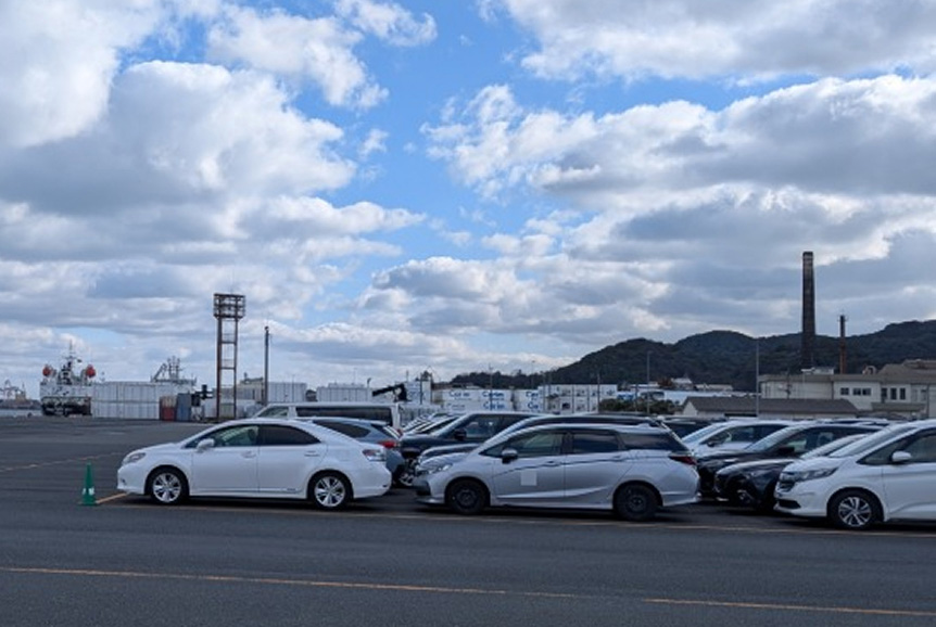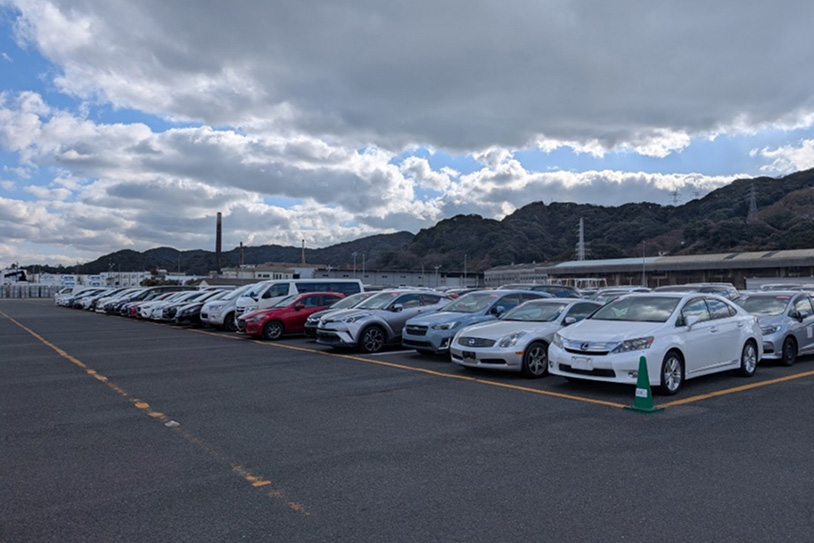 輸出車輌の前受けヤード(物流センター)は港に至近で、船積前 検査施設も隣接。 自動車船の着岸は前受けヤードの目の前の岸壁で、船積みまでの流れは非常にスムーズ。 車両買い付けから輸出までのリードタイムの短縮とコスト削減に貢献します。