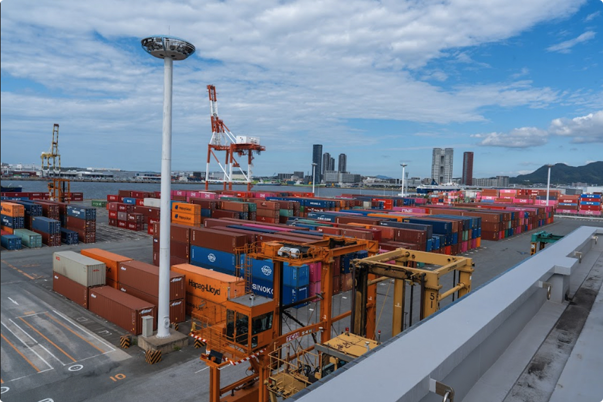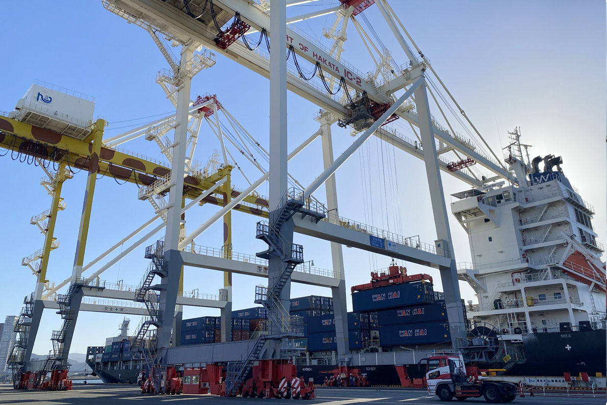 アジアの玄関口となる博多港や関門港など北部九州の港を拠点に、日本と世界をつなぐ海上物流の窓口として港湾施設のオペレーションを行っています。荷役(にやく)と呼ばれる船舶からの貨物の荷下ろしや荷積み作業を通して、輸入においては国内最初の輸送工程、輸出においては国内最後の輸送工程を担い、またスムーズで安定した物流の流れを確保し、モノの動きを支えるインフラ的役割を果たしています。