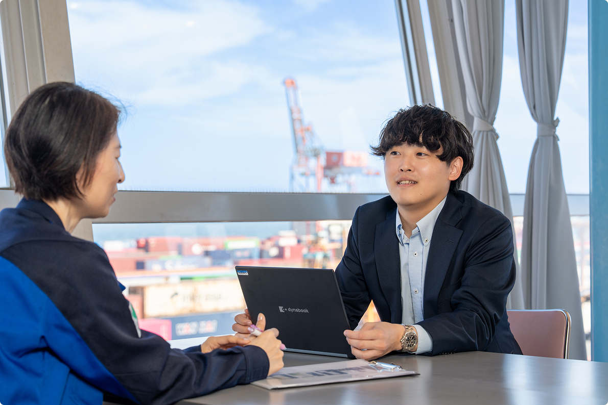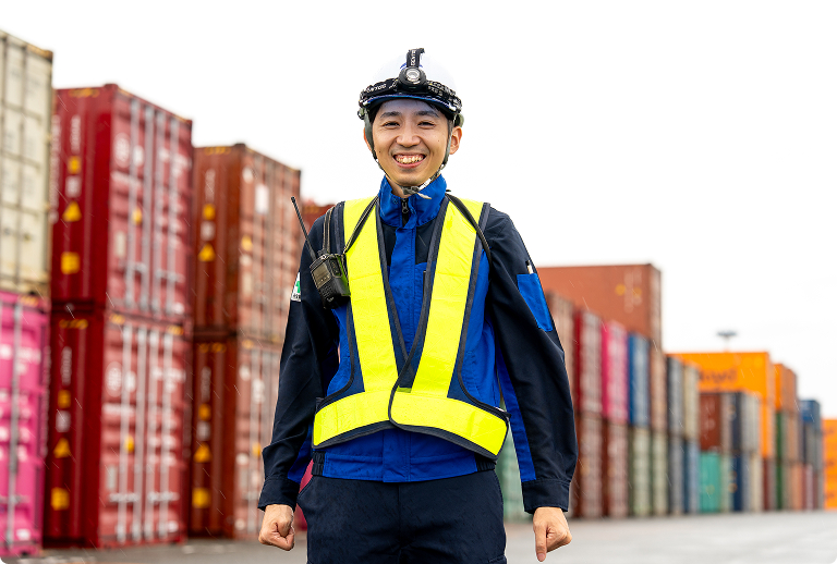 港湾運送部門では、福岡市や北九州市など九州の主要港において、コンテナターミナルの運営やオペレーション事業を行っています。また、輸出入貨物やコンテナを船から陸へ卸したり、また船積みを行う「荷役(にやく」)と呼ばれる作業のスーパーバイザーとして、貿易現場の最前線でさまざまなステークホルダー(関係者)間の橋渡し役を担います。
